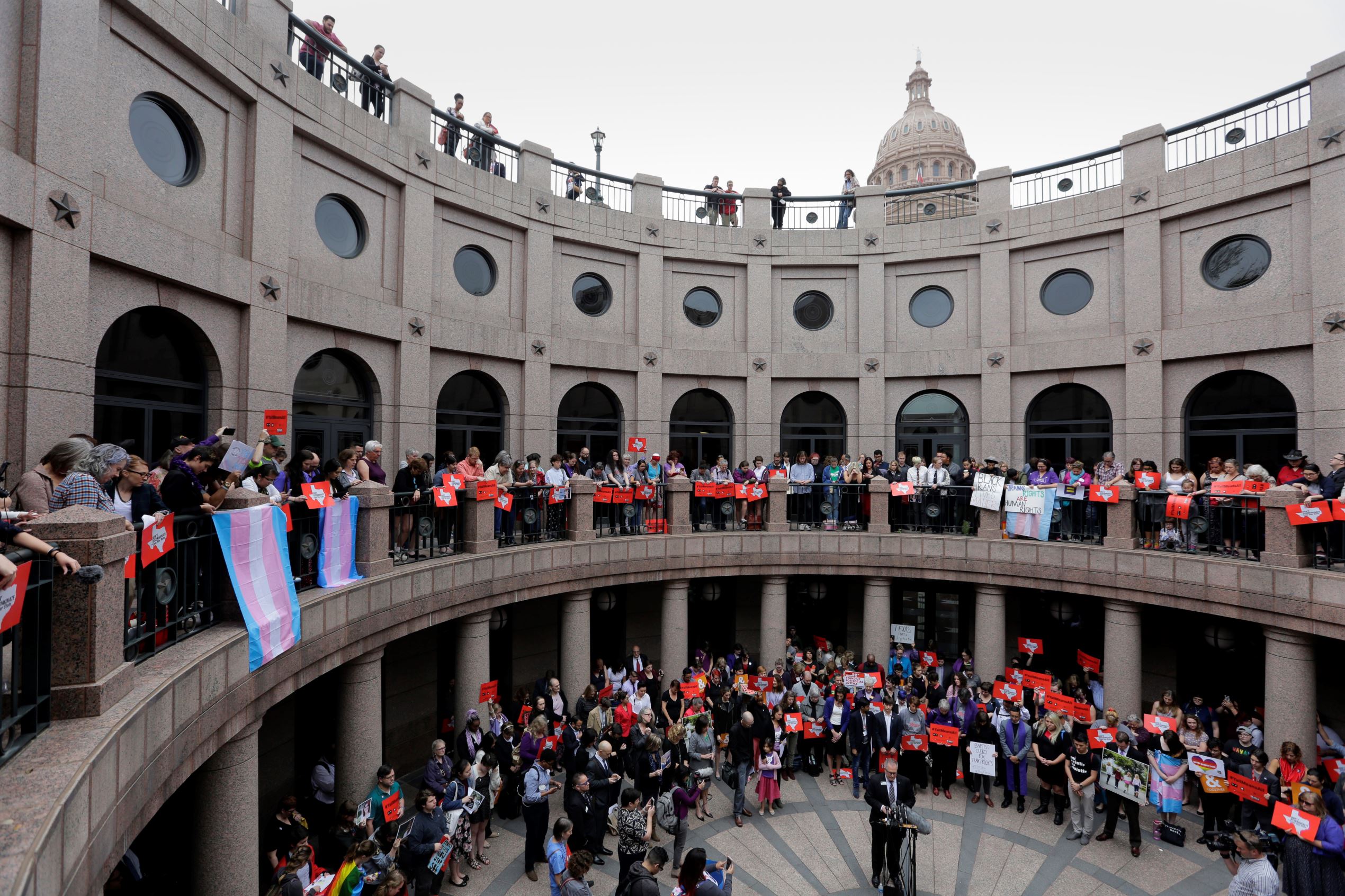 © Eric Gay/AP Photo Members of the transgender community and others who oppose Senate Bill 6 protest in the exterior rotunda at the Texas Capitol as the Senate State Affairs Committee holds hearings on the bill in March in Austin, Texas.